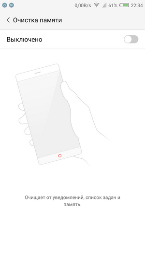 Если удерживать сенсорное кольцо (Домой), то откроется список всех последних запущенных приложений. Их можно почистить выборочно или сразу все автоматически. Если автоматически закрыть все приложения, тем самым освободить оперативную память, появится сообщение: «Работа телефона была ускорена».